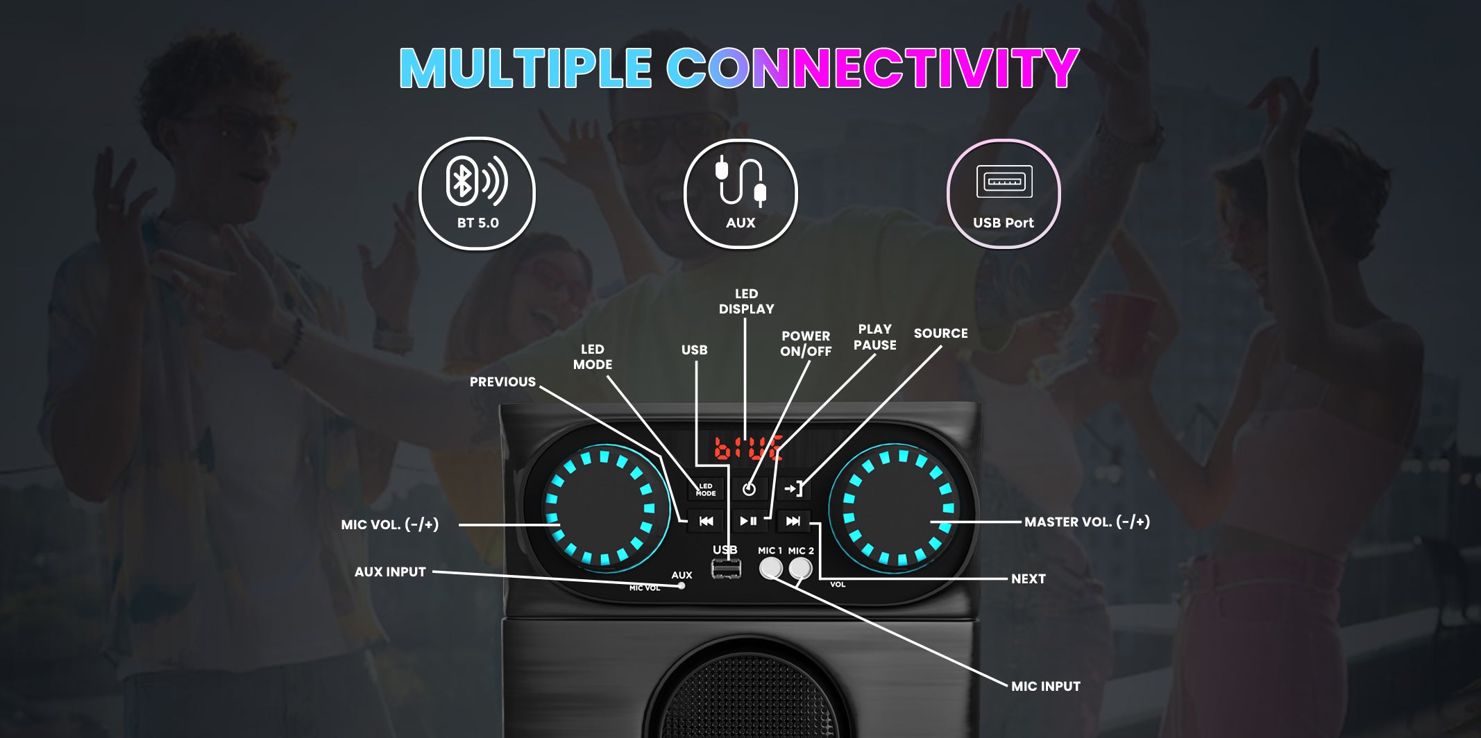 UHF Wireless MIC & Wired MIC, Digital LED Display, RGB Lights, Multiple Connectivity Bluetooth, USB, FM, AUX & SD Card and Remote Control