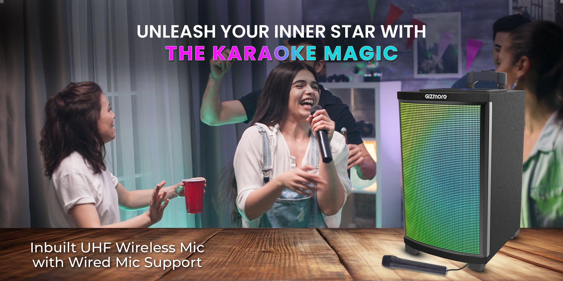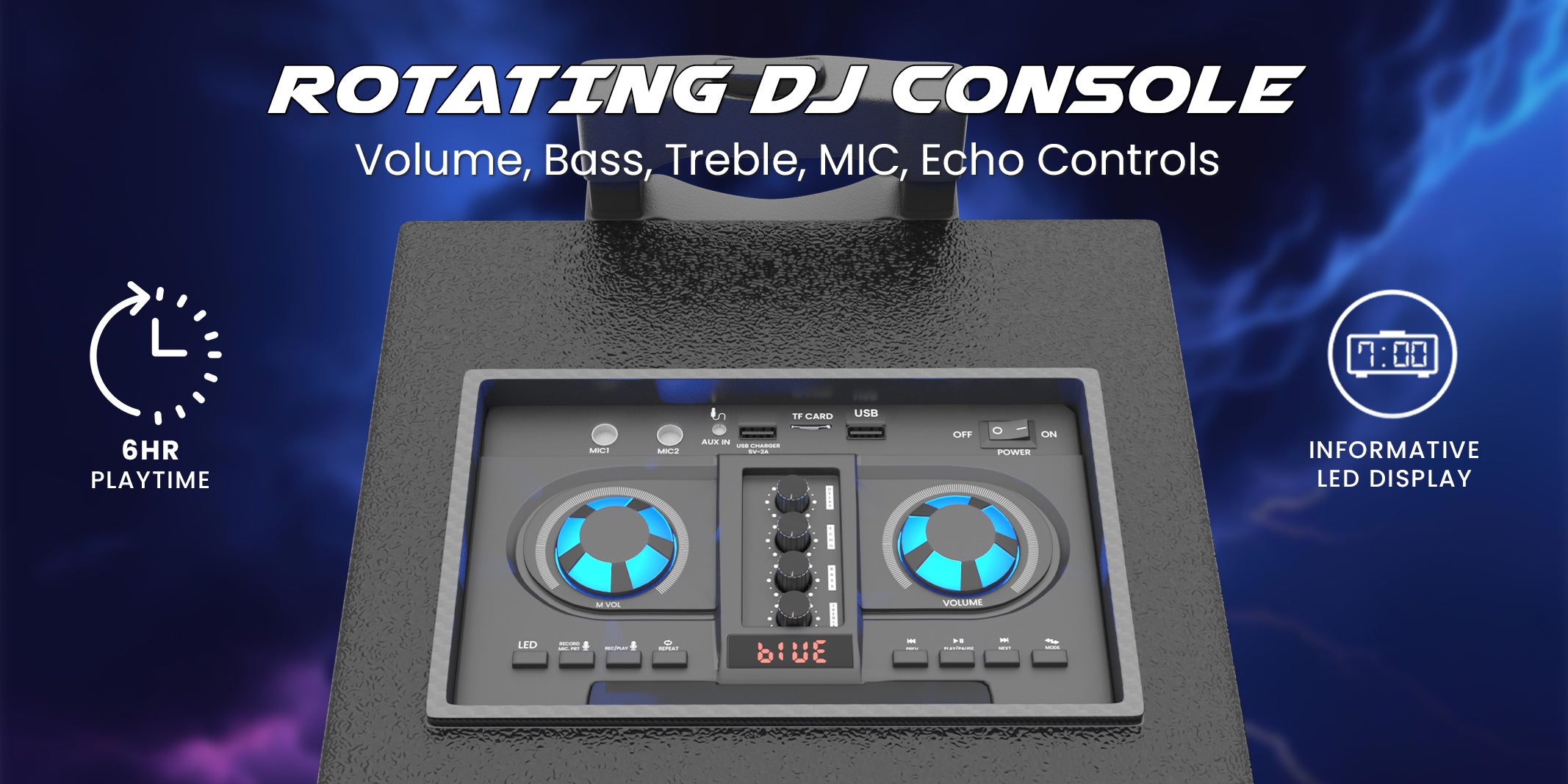 6 Hrs Playtime| UHF Wireless MIC| Digital LED Display| RGB Lights| Equalizer Mode | DJ Console | Volume, Bass, Treble MIC ,Echo Controls | USB Port for Mobile charging