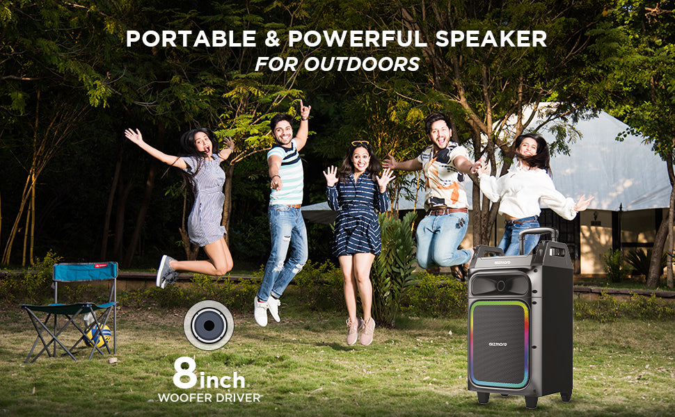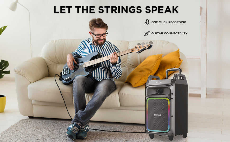 Upto 4 Hrs Playtime | Dual Wireless MIC | Digital LED Display | RGB Lights | TWS Function | Guitar Connectivity | Volume, Bass, Treble MIC, Echo Controls | Remote Control
