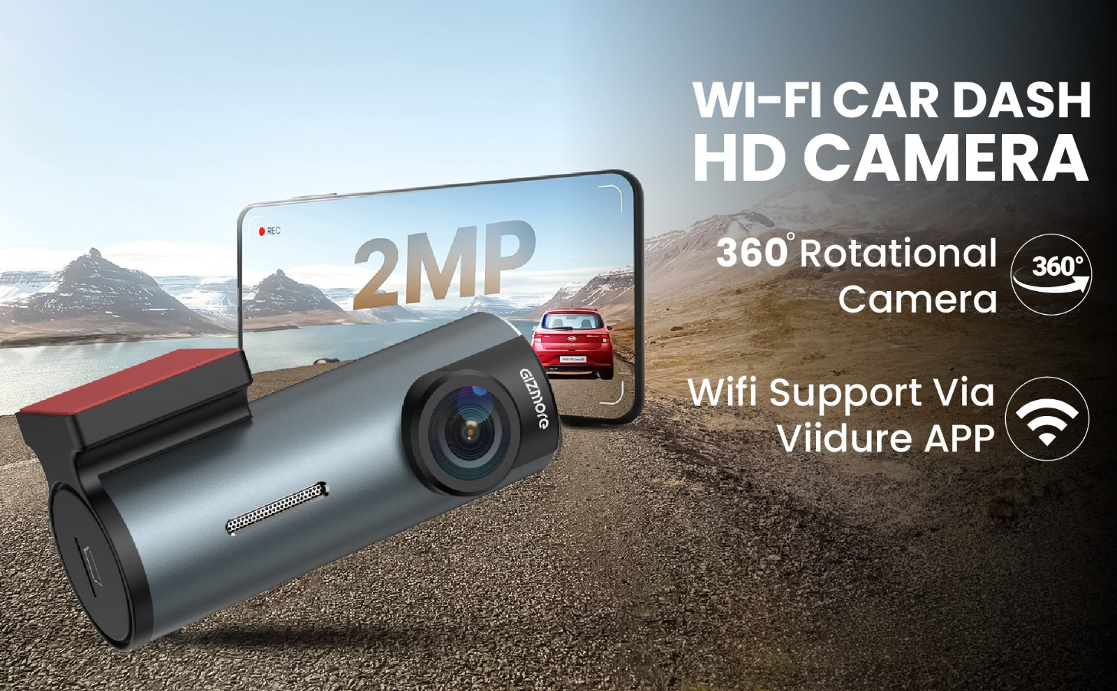 Gizmore Auto Sight Wi-Fi Dash Camera – USB Plug & Play, 360° Rotatable Design, 2MP FHD 1080p Recording, Loop Recording, 145° Wide View, Super Night Vision, Wi-Fi Support with Viidure App for Easy Viewing