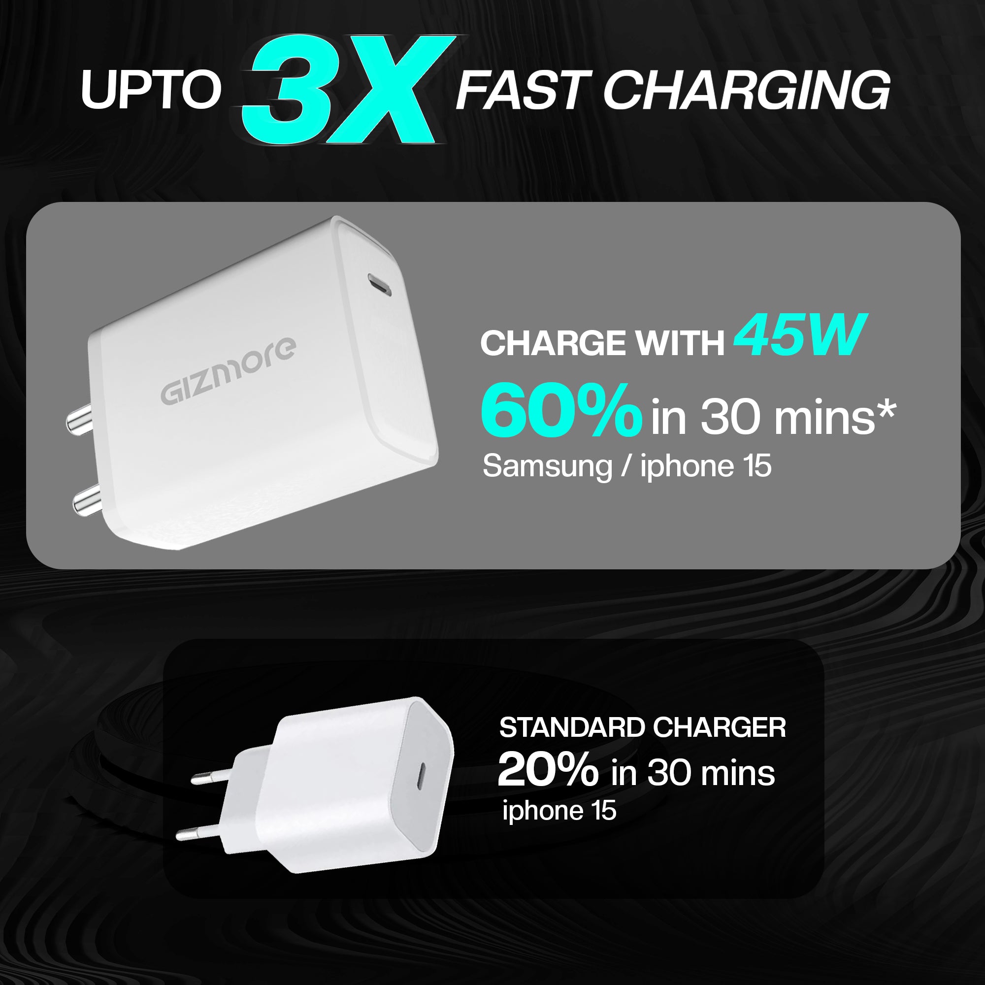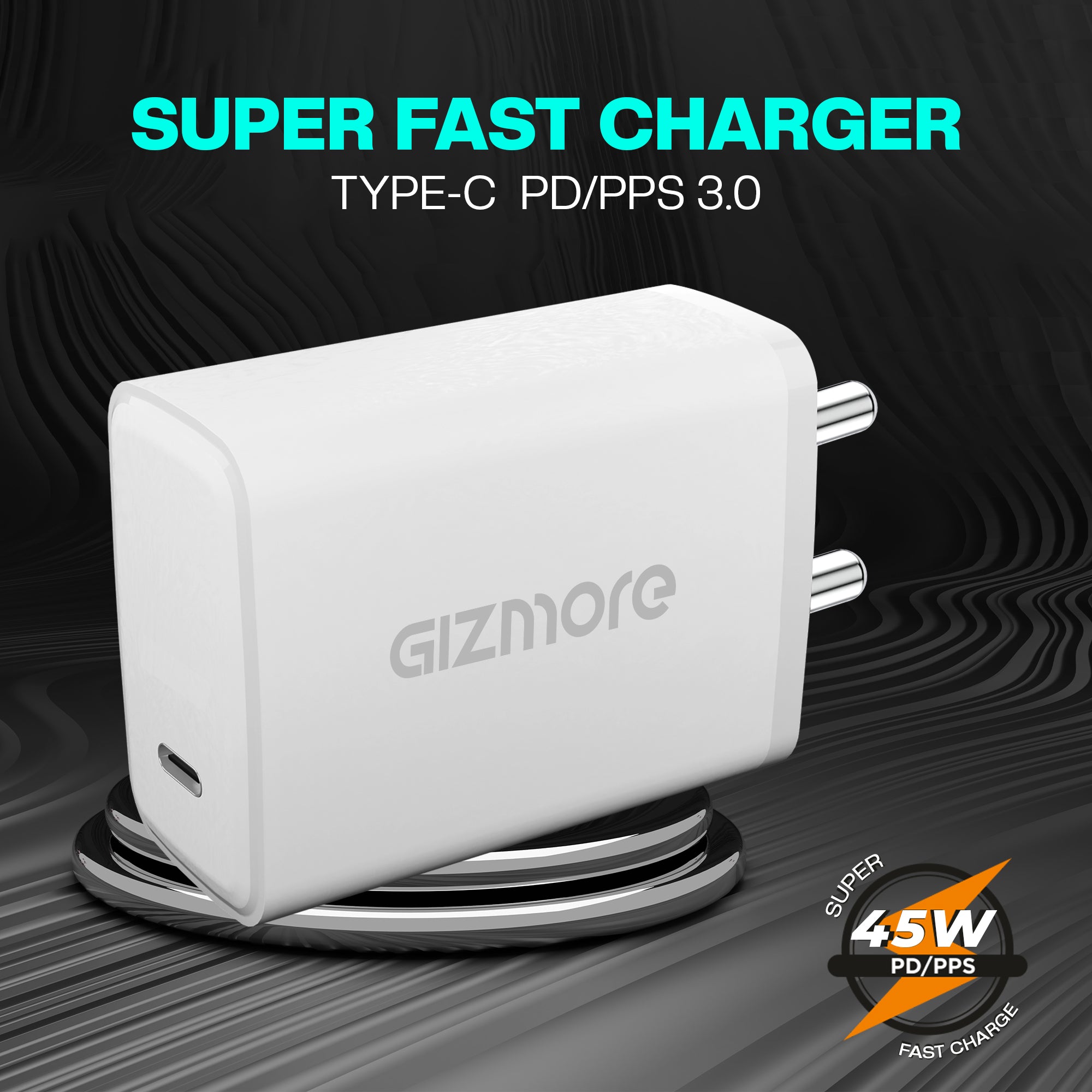 GIZMORE PA645 TYPE-C PD/PPS 3.0 45 Watt Power Adaptor Compatible With All Apple PD Devices, All Samsung ,Nothing, Mi/Xiaomi (ultra-fast ,Turbo Charging)