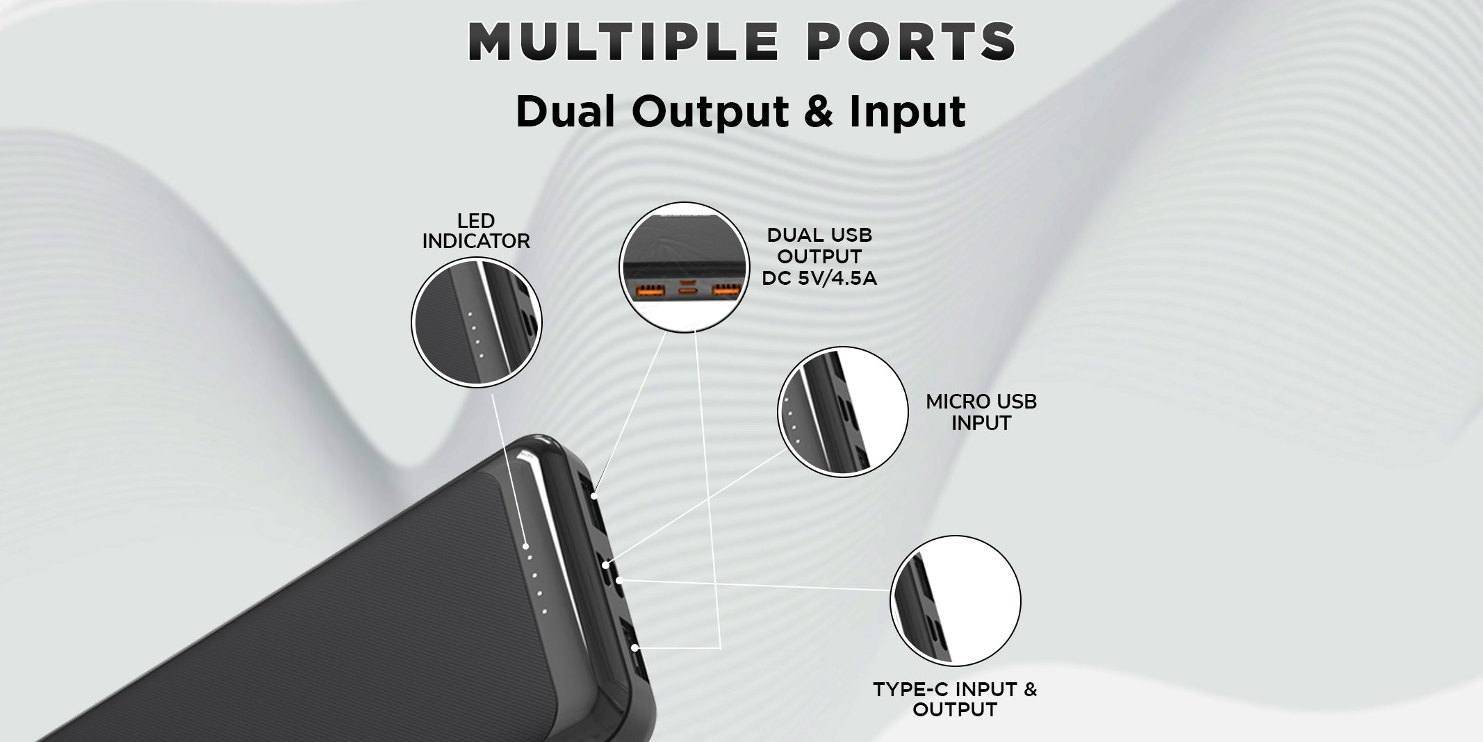Dual USB Output | 1 Micro USB Input | Type C (Input & Output) | LED Indicator | Type-C Charging Cable