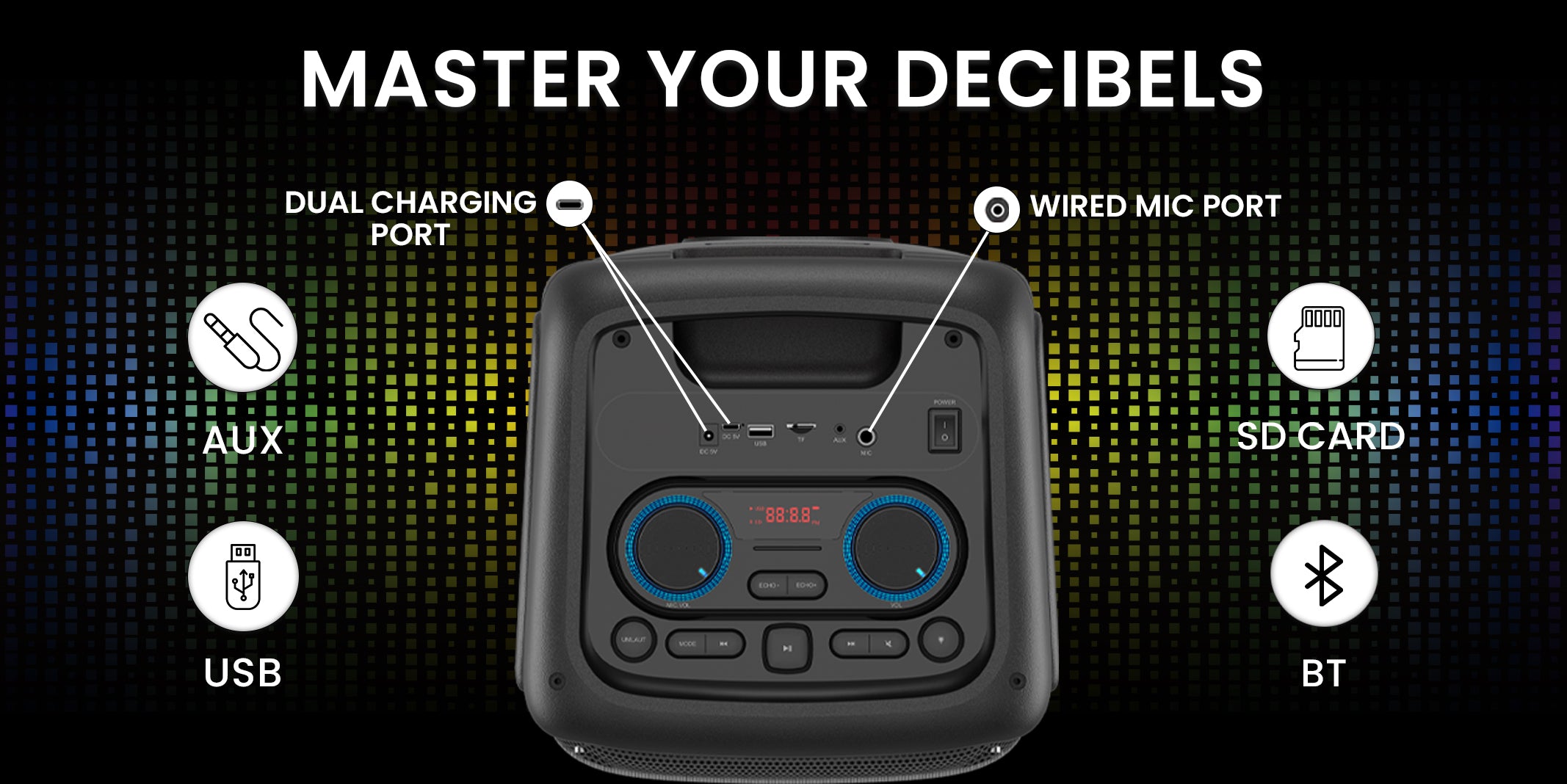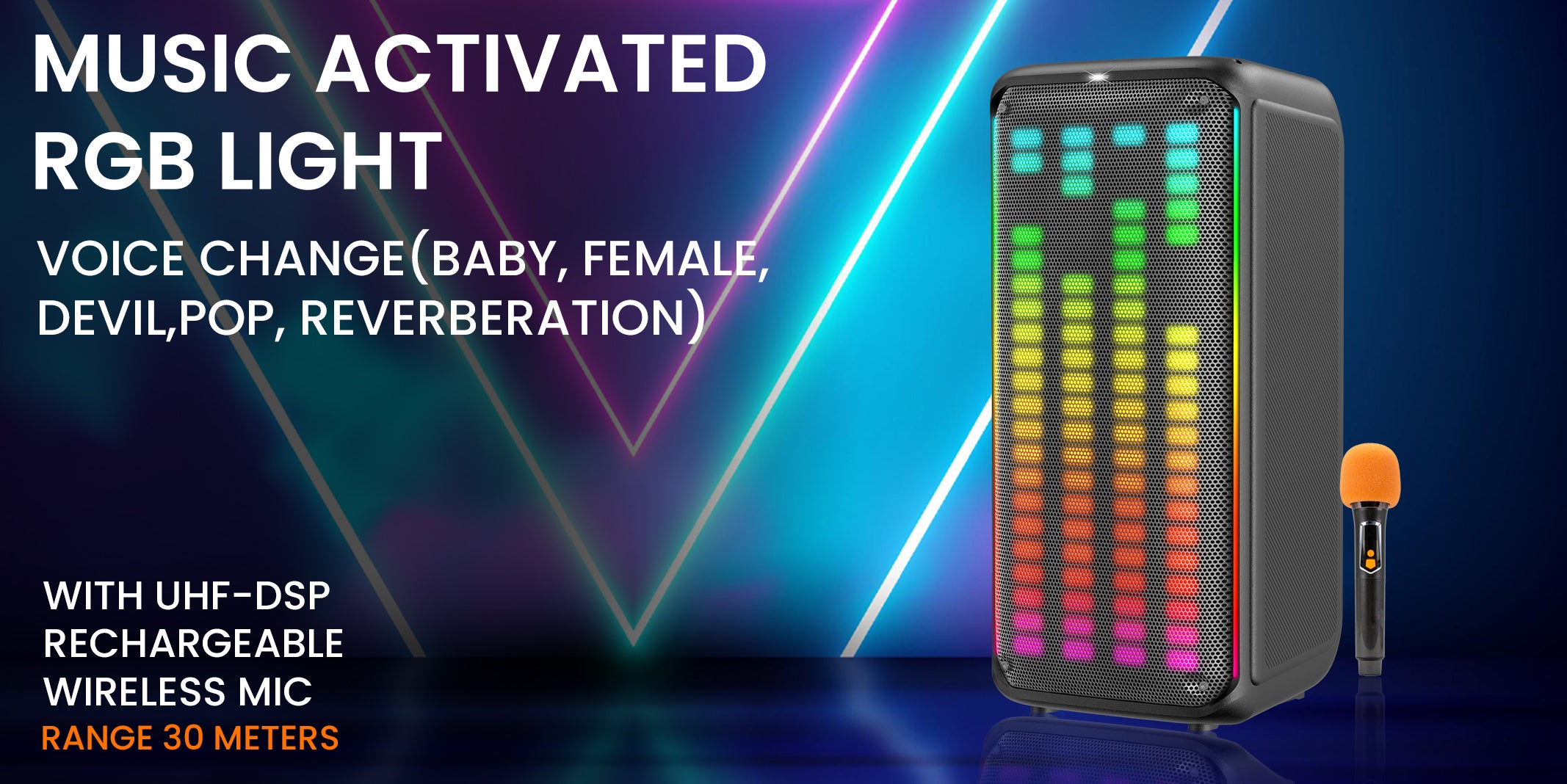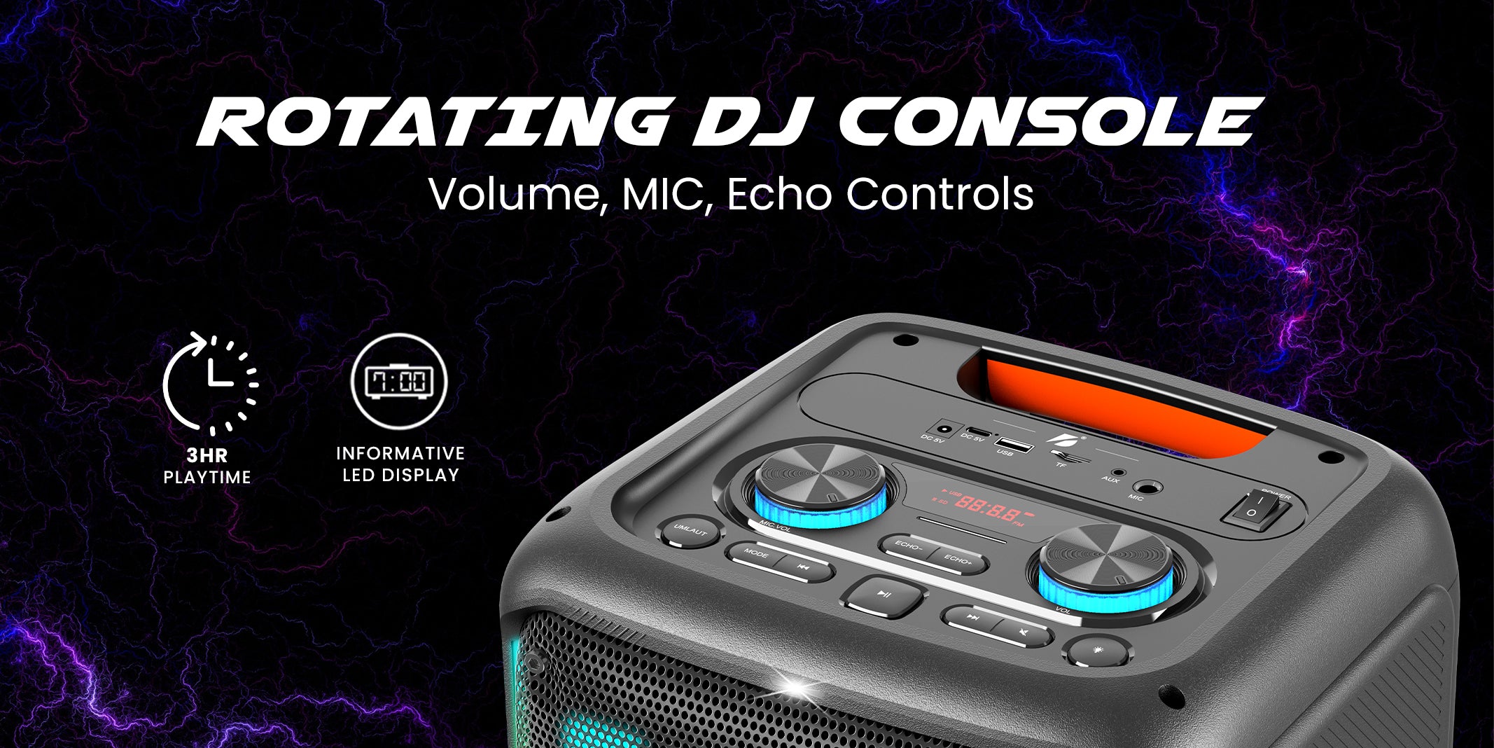 3 Hrs Playtime | UHF-DSP MIC Range 30 Meters | Digital LED Display | RGB Lights | TWS Mode | Remote Control | DJ Console | Volume, MIC Echo Controls