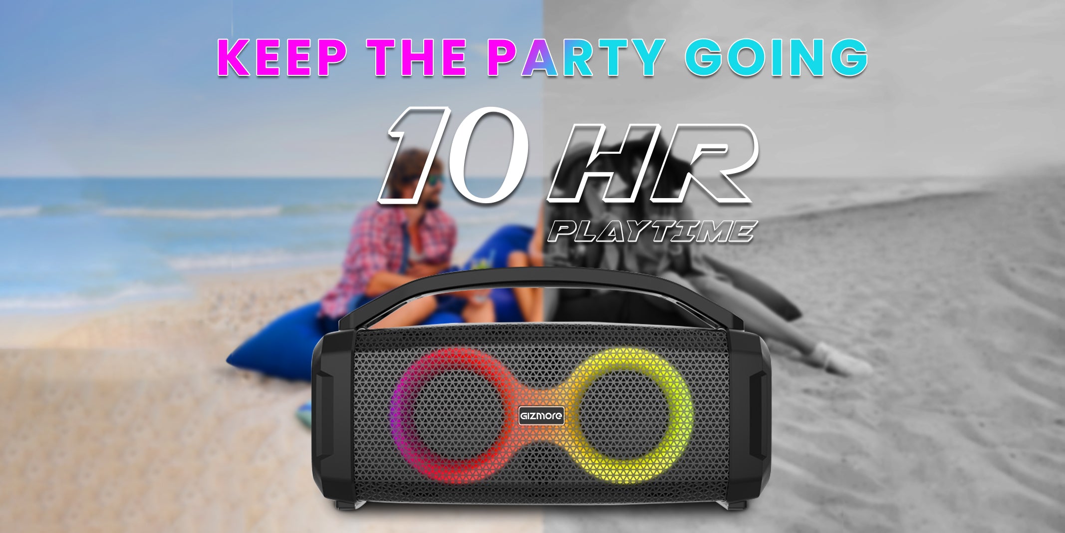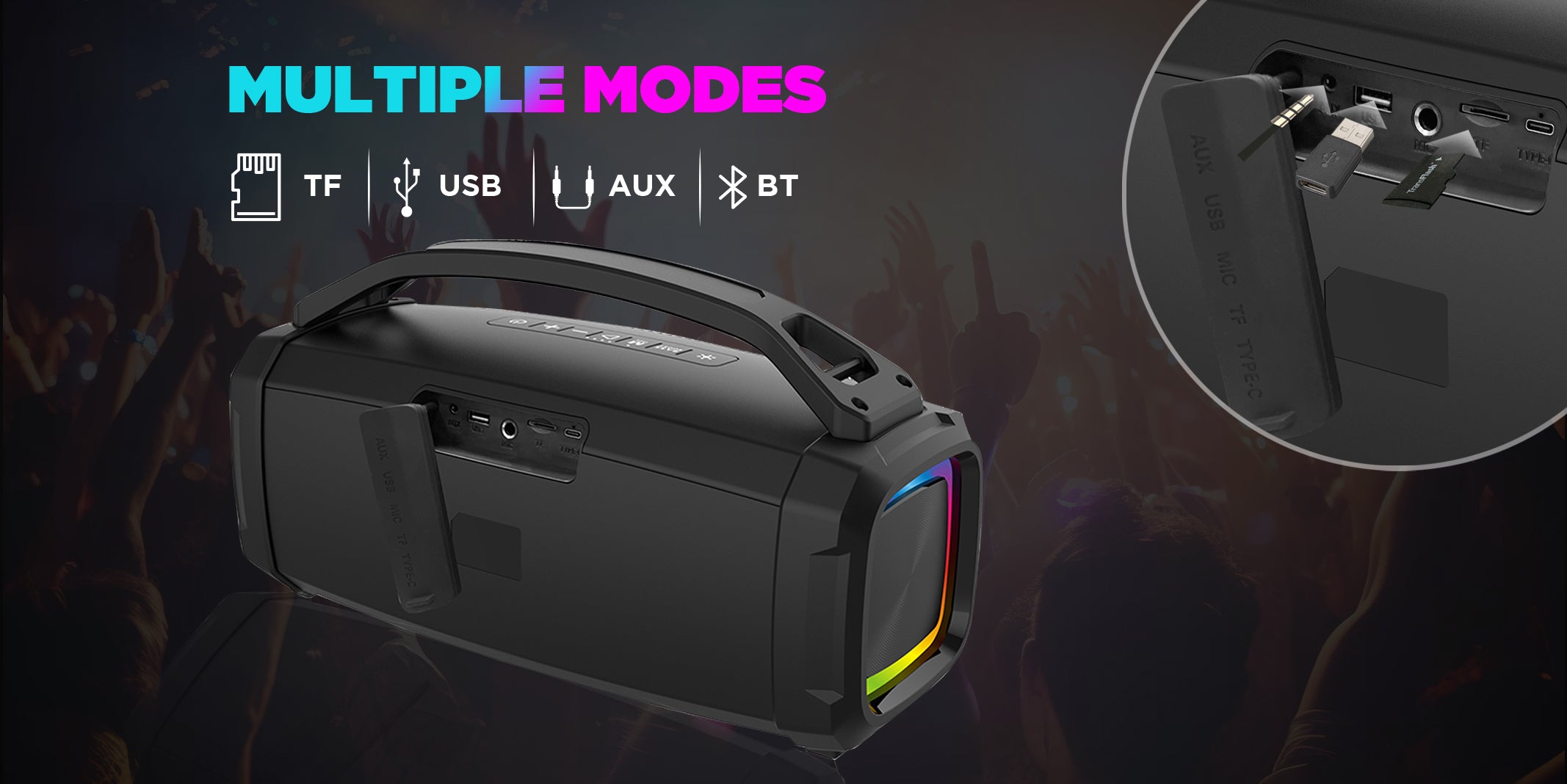 Upto 10 hrs Playtime | High Bass | Type C Charging |13 Modes of RGB Lights | Wired MIC | IPX5 Splash Proof | TWS Function | Karaoke Function | Dual Grip Handle & Belt Option | Volume Control